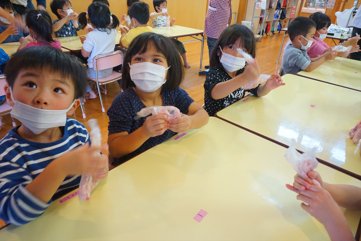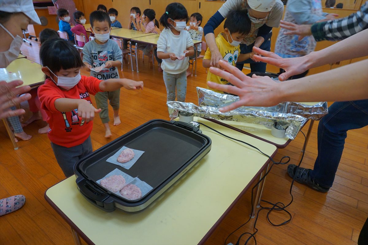 こころぐみさんがハンバーグ作りに挑戦!材料をビニール袋に入れて、手でこねて、ホットプレートで焼きましたよ。自分たちで作ったハンバーグは最高だね!