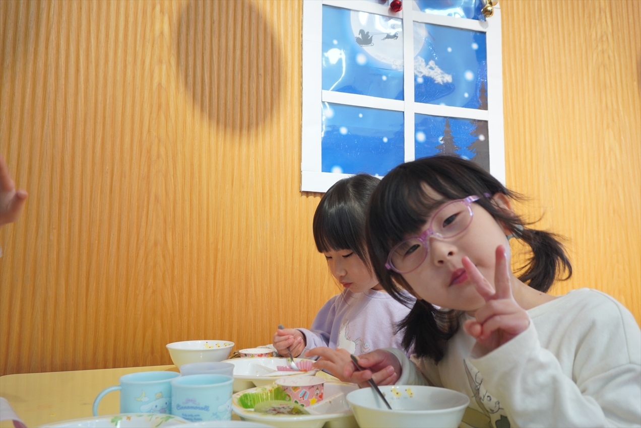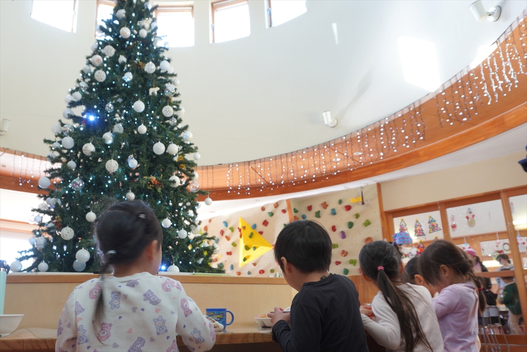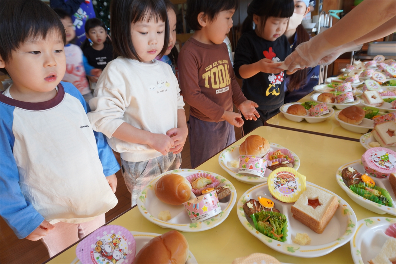今日はクリスマスパーティ☆サンタさんがやってきて、プレゼントをいただきました!給食はホールでバイキング!いつもと違った雰囲気に子どもたちも大喜びです🎵