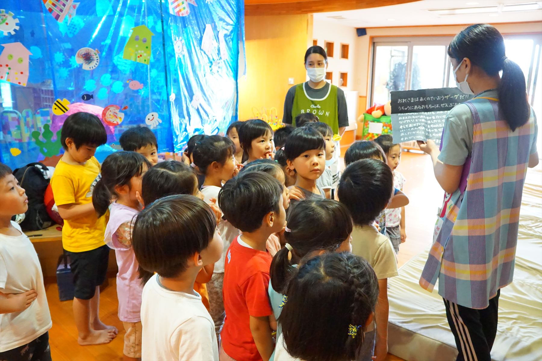 年長さんの一大イベント「お泊り保育」。今年もお泊りはできませんでしたが、「お泊りごっこ」として楽しみました!日中はアイス作りやハンバーグ作りをし、夕方には楽しみにしていた「夜の冒険」。ちょっと怖かったけど、みんなの力を合わせて楽しみました!