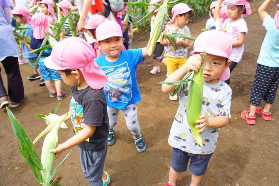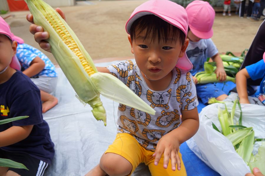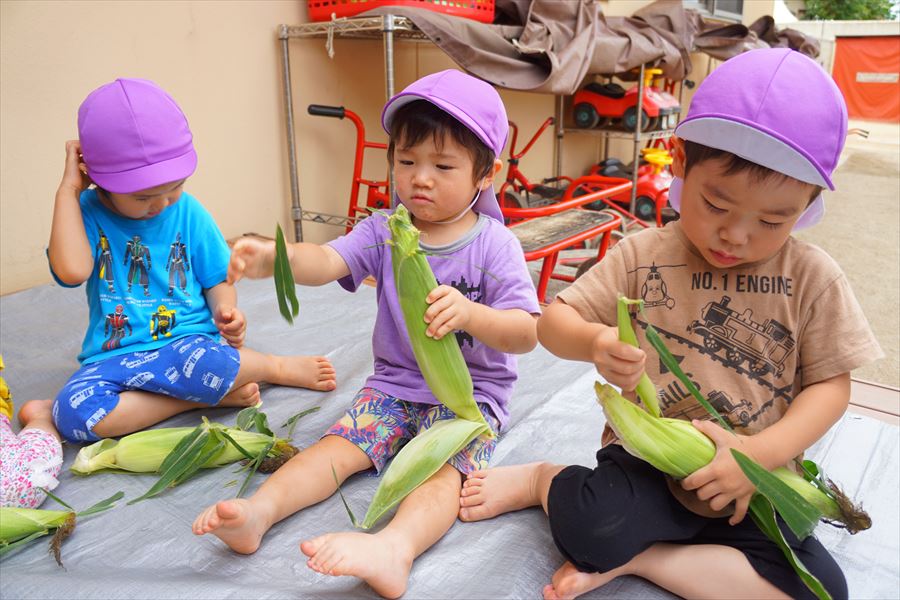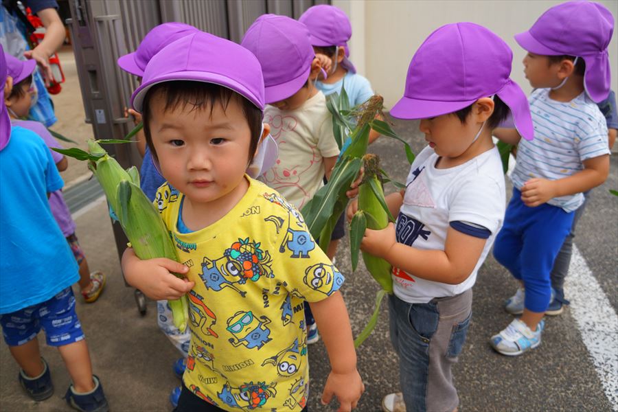 つちぐみさん、たいようぐみさんが一緒にトウモロコシ狩りに行ってきました。自分たちで獲ってきたトウモロコシを園まで運び、皮むきまでしましたよ。おやつに食べたトウモロコシは最高だったね!