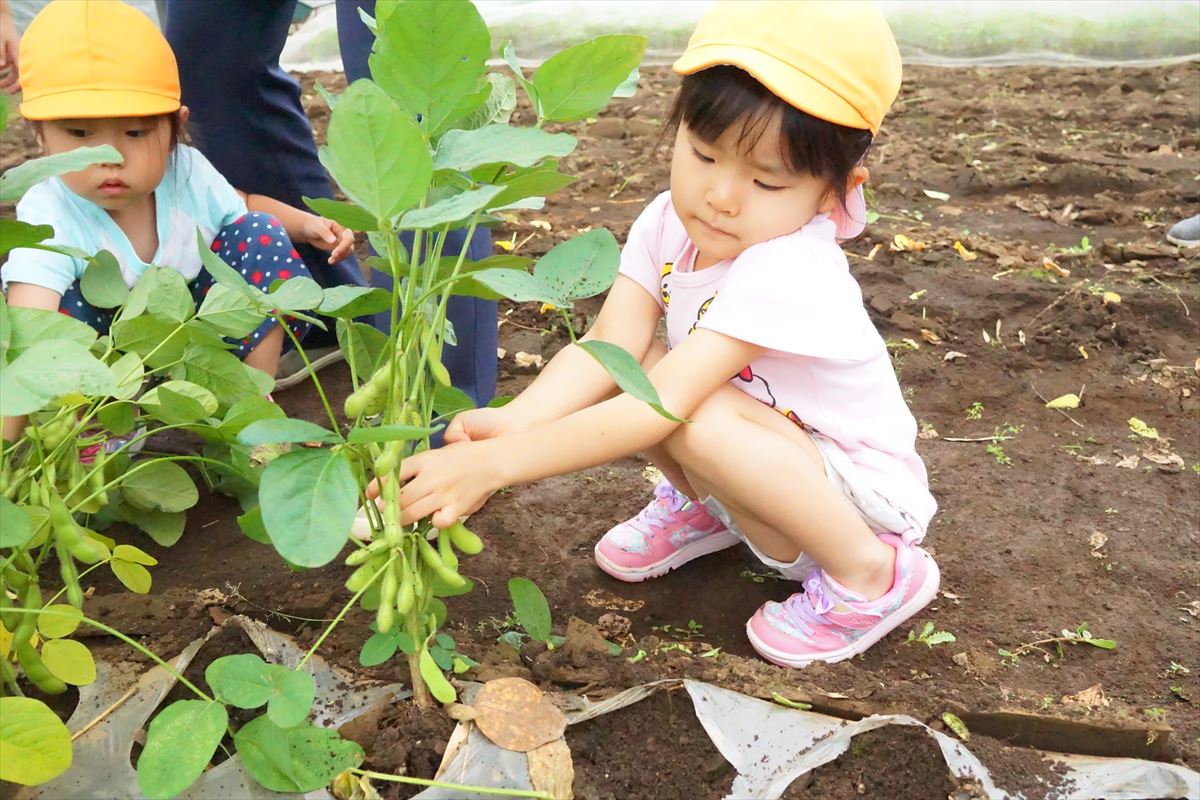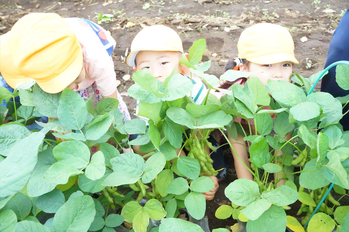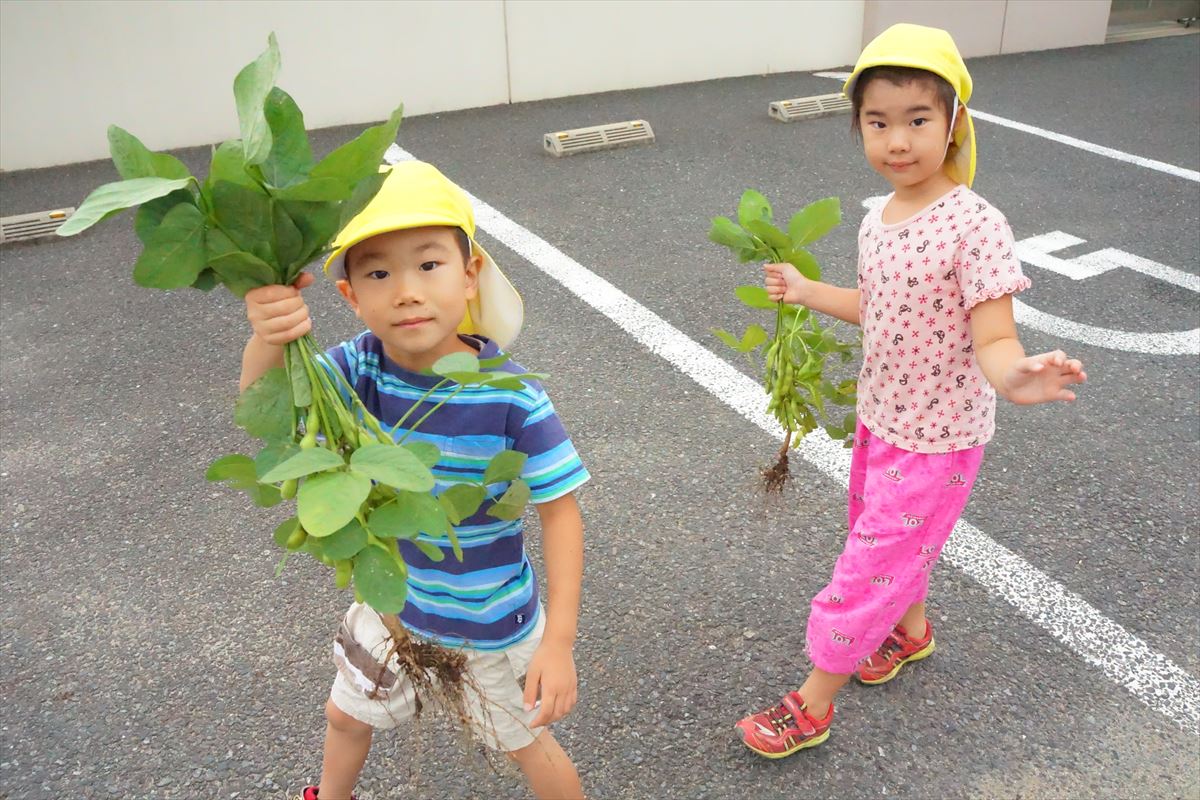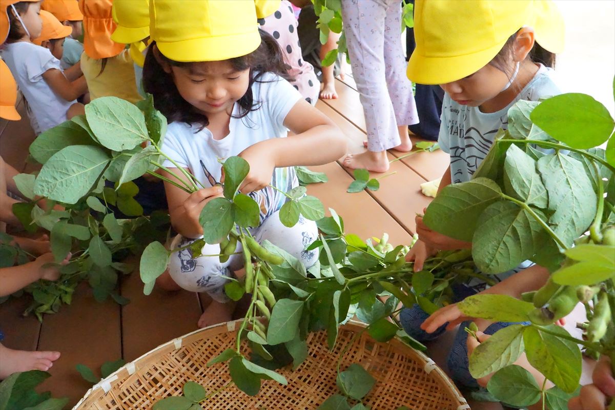 こころぐみ、そらぐみさんが枝豆収穫に行ってきました。収穫した枝豆は園に帰ってきて、自分たちで鞘を取りその場で試食会です。茹でた枝豆、焼いた枝豆、揚げた枝豆を食べ比べましたよ。採りたての枝豆はおいしいね!