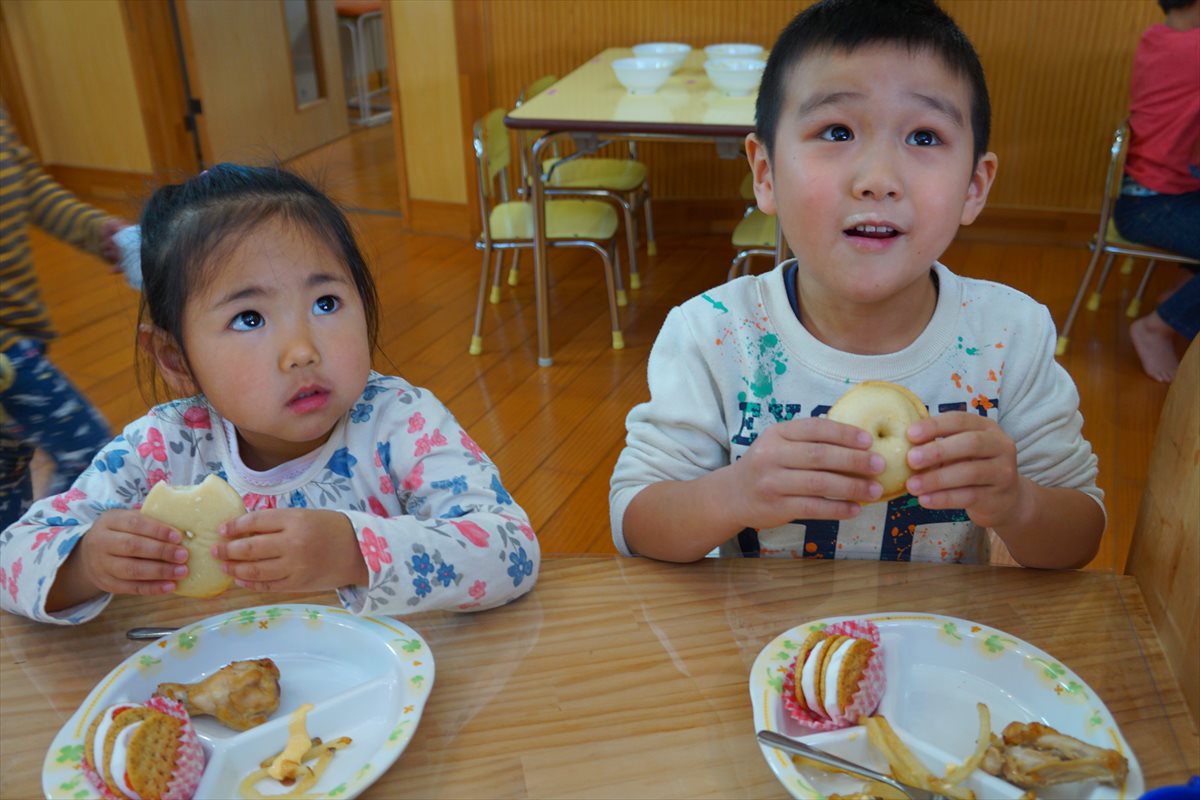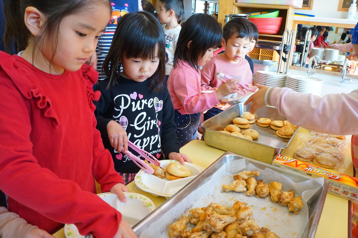 今日は1月生まれのお友達のお誕生日会。1月生まれのお友達、お誕生日おめでとう!「タオルシアター」でお誕生日のお祝いをしましたよ。お楽しみのお誕生日バイキング、今月は「カナダ料理」。ワッフルやメープルシロップを使ったチキンウイングなどをおいしく食べましたよ!