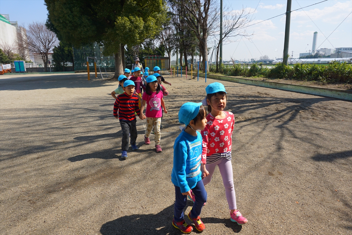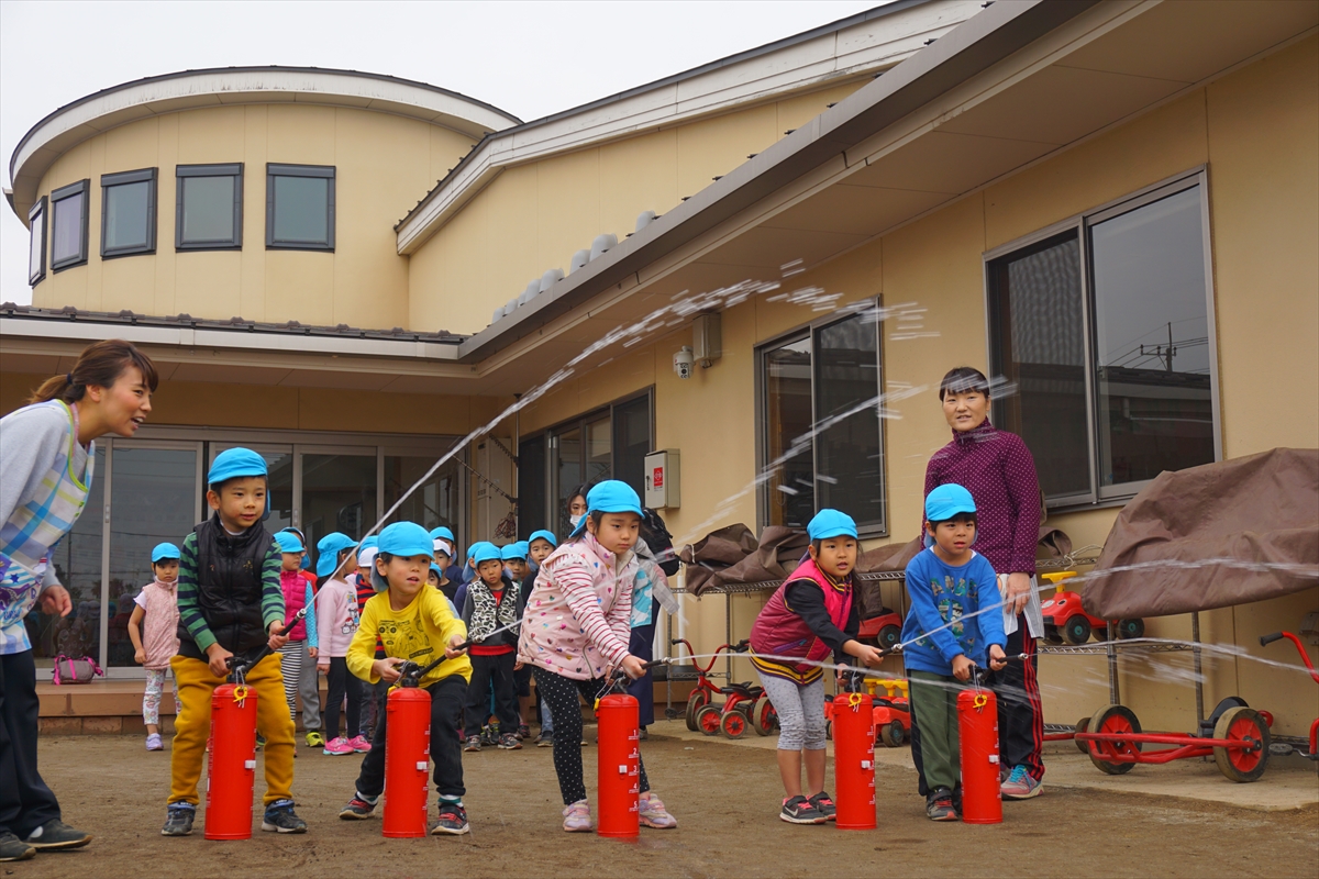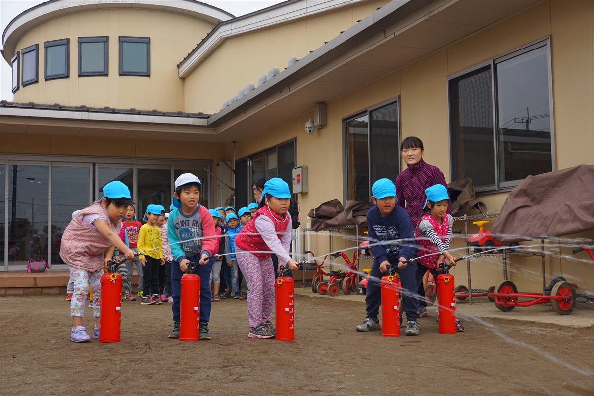 今日は総合避難訓練をしました。みんなで園庭に避難し、「おかしもち」のお話を聞いた後は、全園児一人づつ水消火器の実践です。中々触れることの無い消火器に大喜び。真剣な表情で取り組んでいましたよ!