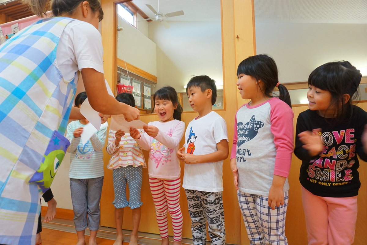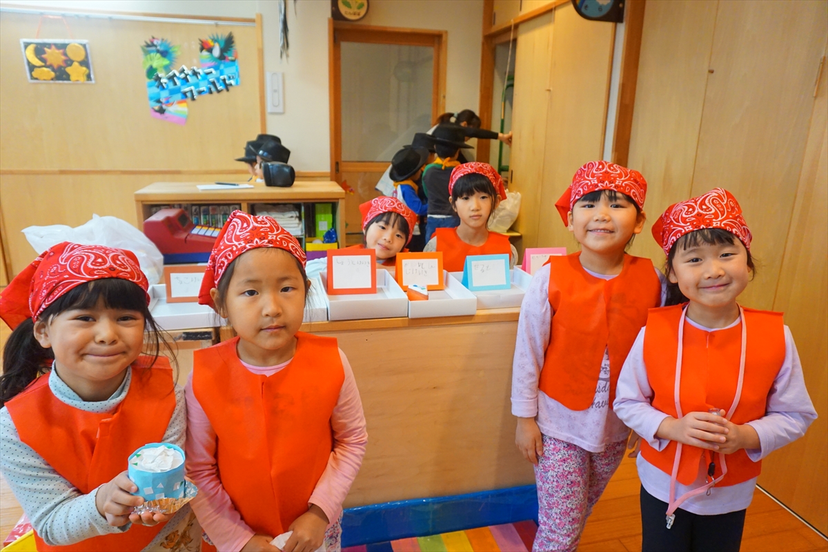 今日はお店やさんごっこ!そらぐみさんがお店やさんになって、小さい子たちをご招待。ハンバーガー屋さんやケーキ屋さん、おもちゃ屋さんにボーリング。お店を頑張ったそらぐみさんには表彰状の授与です!お昼は屋台風メニューで楽しく食べました。みんな楽しめたね!