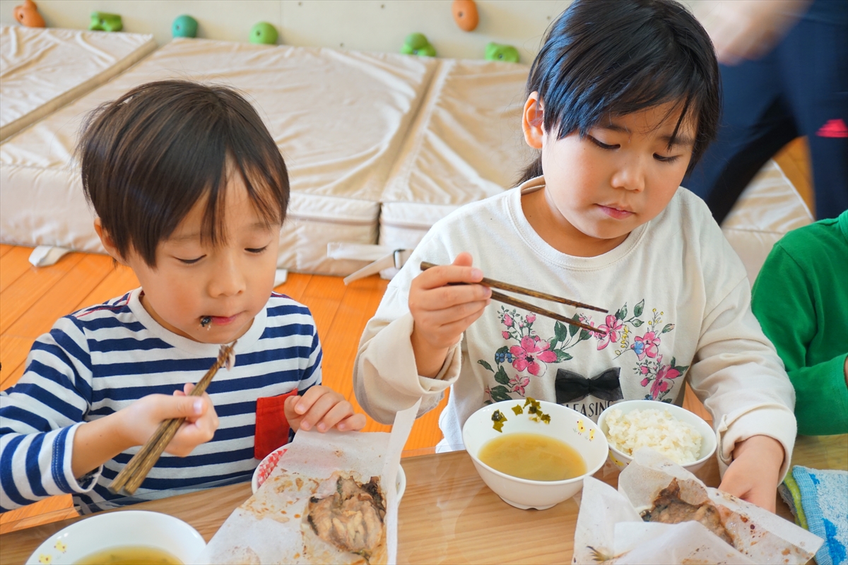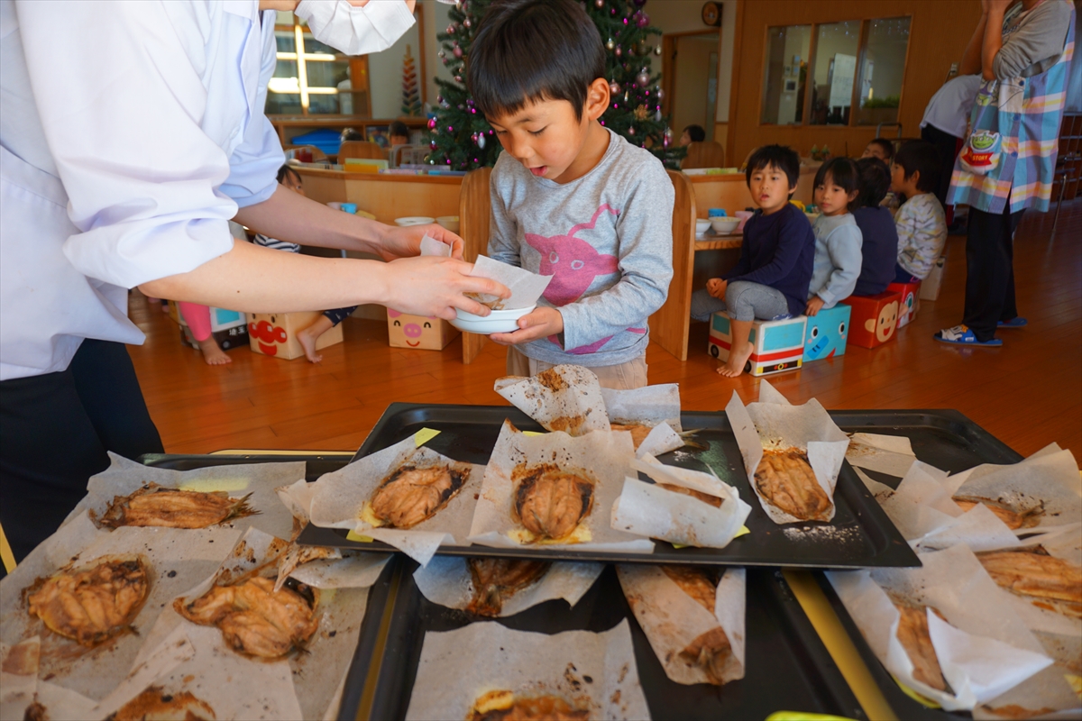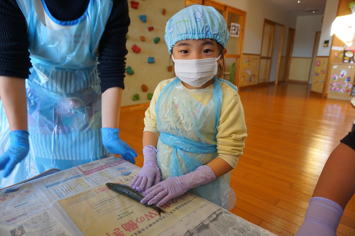 そらぐみさんが【いわしの手開き】に挑戦しました。栄養士の先生に捌き方を教えてもらい、頑張ってチャレンジしていましたよ。中には怖がってしまう子もいましたが、全員が最後までできました。【大切な命をいただく】ということを知るいい機会になりましたね。自分たちで捌いたいわしをおいしく、大事にいただきました。