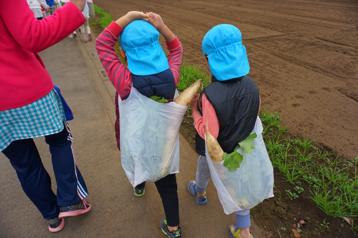 同じ市内の保育園の年長さんが集まって、みんなで大根掘りに行ってきました!例年以上に抜くのが大変でしたが、頑張って大きい大根を抜いてきましたよ!そこからはもうひと頑張り。保育園まで自分たちで持って帰ってきました。「つかれたぁ~」「おもかった~」と子どもたち。頑張りました!