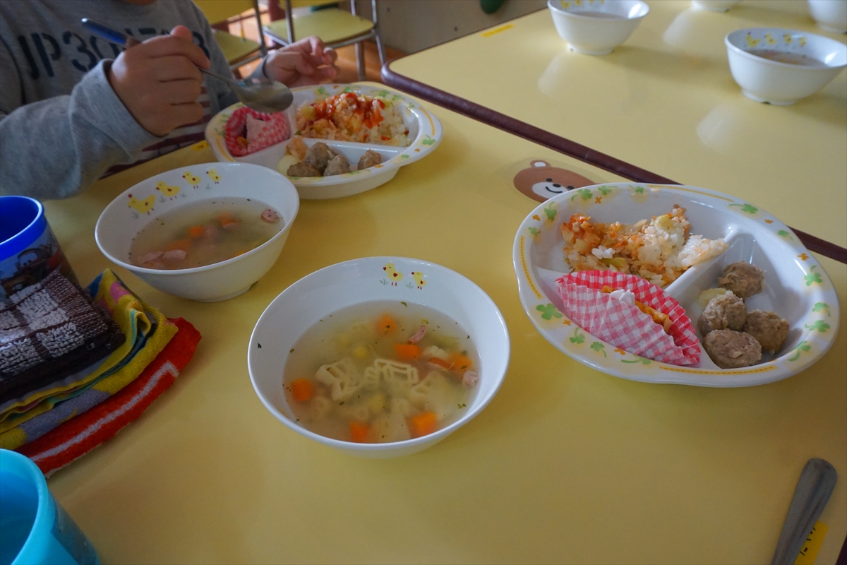 0歳児クラスから全クラス参加の【炊き出し会】を行いました。0歳児クラスのわたげぐみさんもお野菜を運んでくれて、頑張りましたよ。メニューはみんなで作った「とり汁」、「おにぎりトッピング」、デザートに「フルーチェ」。たくさん食べておいしかったね!