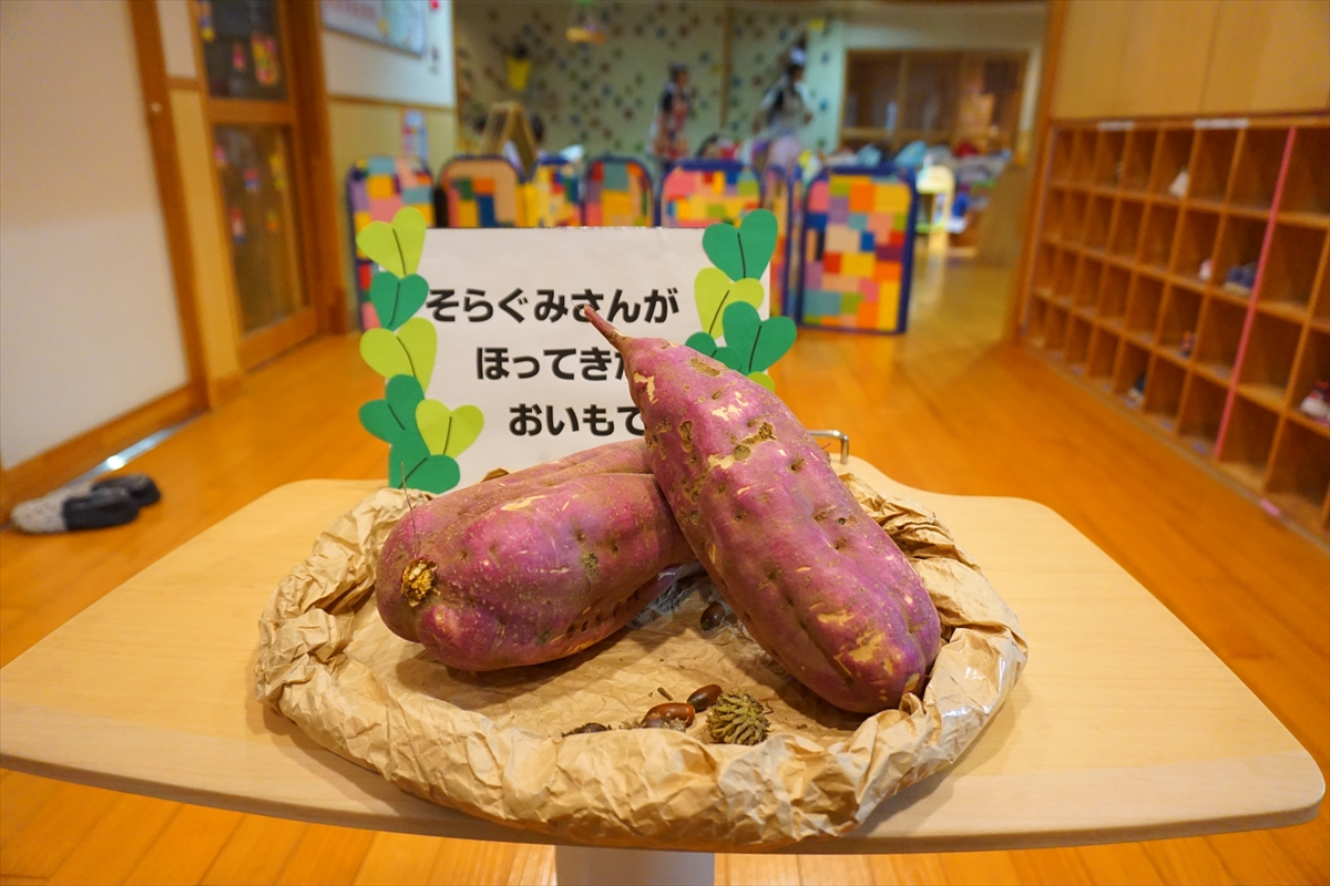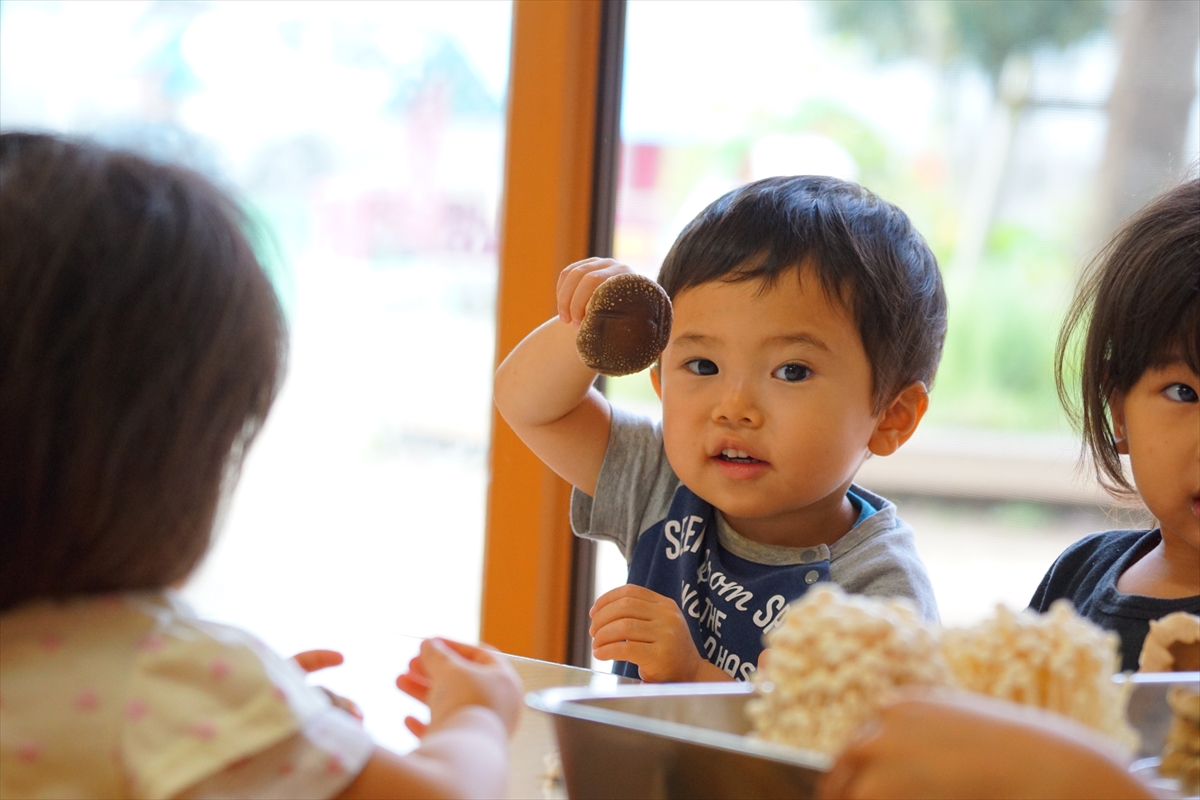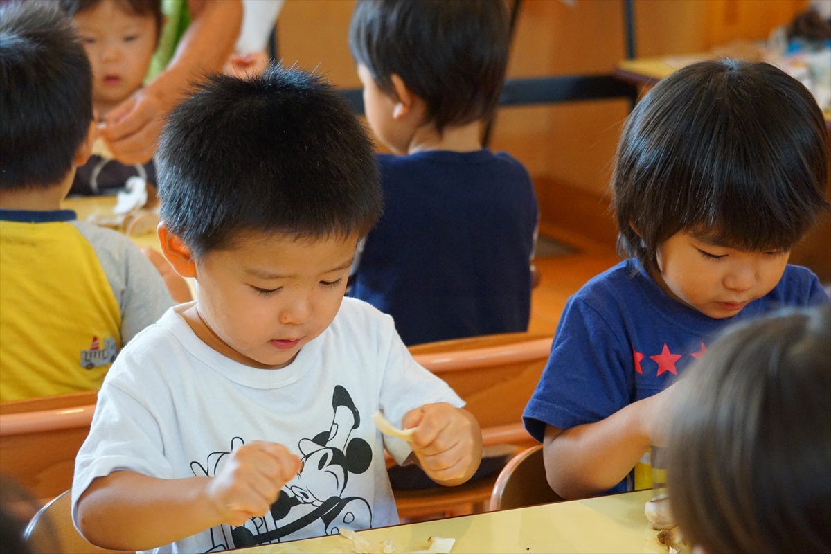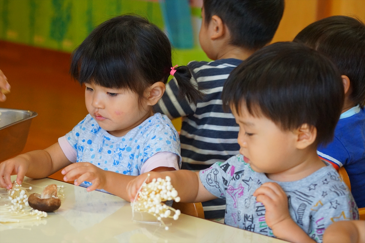 今日はかぜぐみさん、つちぐみさんが秋の味覚のきのこに触れましたよ。自分たちできのこを調理しやすいように頑張ってさいていました。給食にきのこが出ると喜んで食べていました。